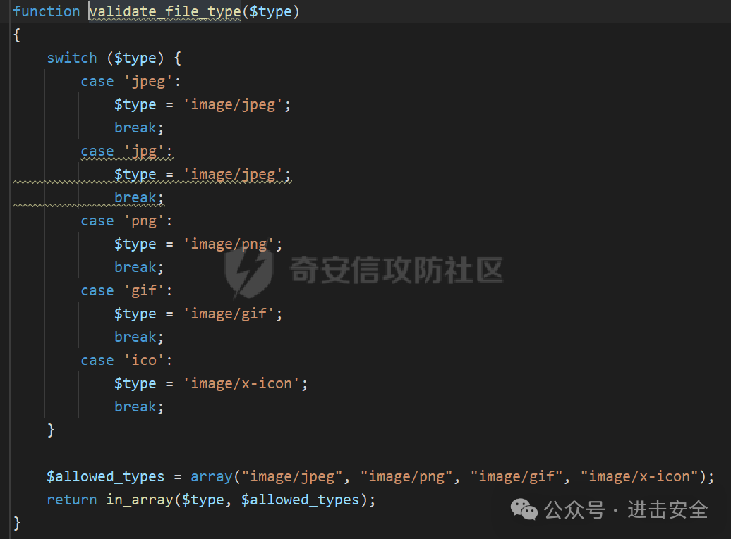 其中存在一个过滤就是获取文件后缀名调用了方法validate_file_type,跟入这个方法看看如何过滤的。