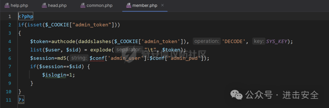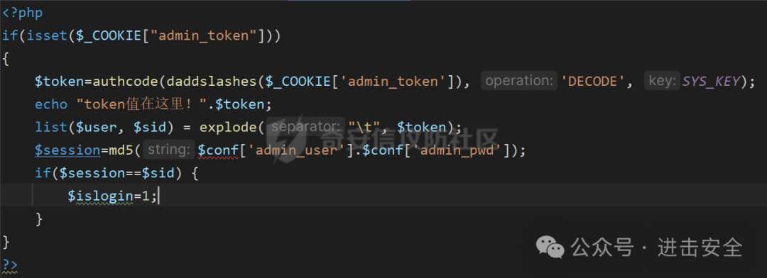 这里发现了判断COOKIE当中的admin_token值进行判断,并且这里进行调用authcode方法给到了token,并且分离出来了user以及sid值,然后进行对于admin_user以及admin_pwd进行md5加密,与sid进行对等,那么这里有两个风险点:1、COOKIE可控,但是调用了authcode方法,这个方法也好说因为COOKIE可控我们可以构造恶意payload让他调用authcode方法结构为我们想要的信息。2、使用了==弱类型比较,我们可以尝试绕过,如果构造出来经过authcode解密之后的值与admin_user以及admin_pwd进行md5加密值相等的话可以绕过鉴权。这里先进行看看authcode调用结束之后是上面信息。