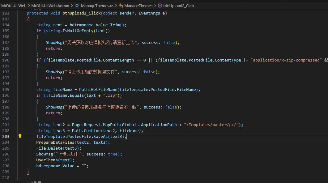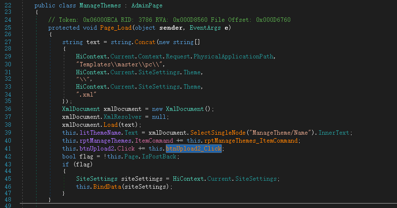 首先来看Page_Load方法,她通常用于处理页面加载时的初始化逻辑。在该方法中首先会解析xml文件,然后分别为 rptManageThem)es 控件的 ItemCommand 事件和 btnUpload2 控件的 Click 事件添加事件处理程序,分别指定为 this.rptManageThemes_ItemCommand 和 this.btnUpload2_Click 方法。