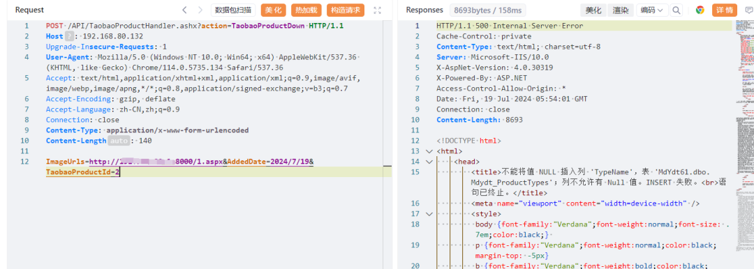 虽然报错了,但实际上是成功下载了的,报错是因为下载之后的步骤,我们也无需理会了。这样木马文件就下载到了服务器,但这里还有一个问题,那就是保存文件的文件名是通过Guid.NewGuid().ToString(“N”, CultureInfo.InvariantCulture)方法随机生成32位字符的文件名取代,路径为/Storage/master/product/images/,所以我们还需要想办法获取下载的文件名。