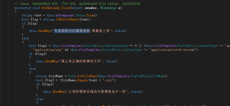 而PrepareDataFiles方法正在在上面的btnUpload2_Click方法中调用,并且通过ShowMsg看出应该是个上传模板的地方