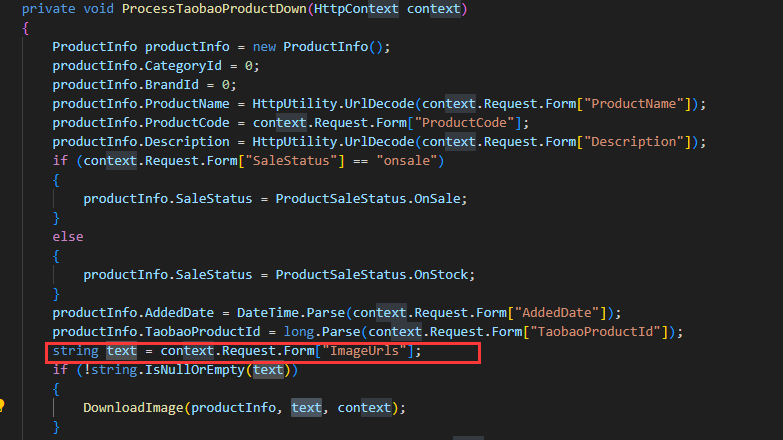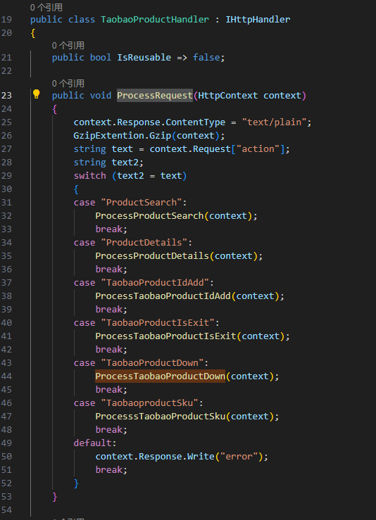 再向上追溯该方法ProcessTaobaoProductDown的调用,发现在ProcessRequest里,该方法是 IHttpHandler 接口的一部分,定义了一个方法来处理传入的 HTTP 请求。