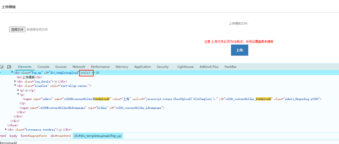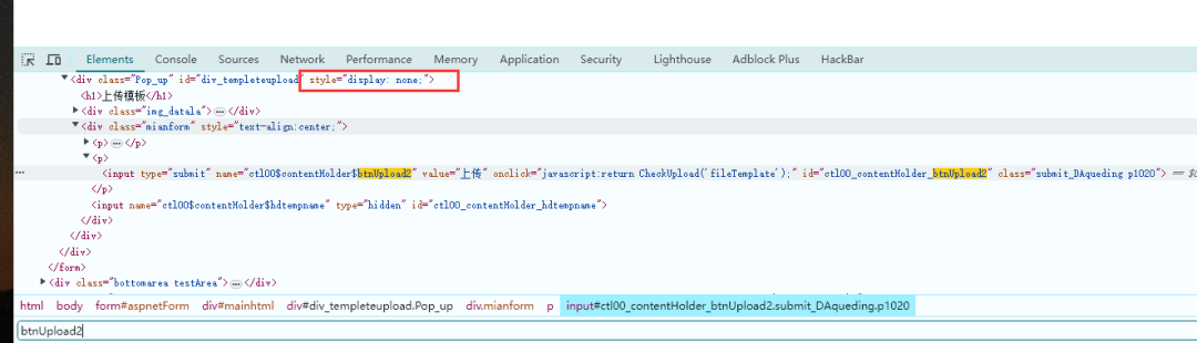 不死心的我在源代码中搜索上传的关键字btnUpload2发现确实存在相关功能,发现只是通过css隐藏起来了