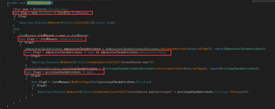 在CheckPageAccess中会检查当前用户是否有访问当前页面的权限。如果不符合条件则被重定向到其他页面,如果都符合则继续后面的流程