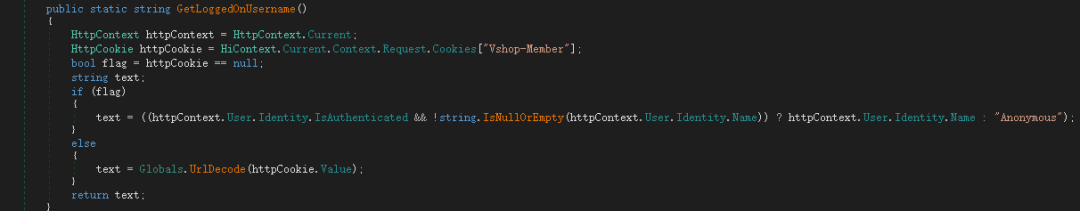 比较有意思的是GetUser()中获取username的方法是GetLoggedOnUsername(),而在这个方法中,是直接取了cookie中的Vshop-Mem)ber参数作为username的,所以如果其他地方直接调用了GetUser()或者先调用GetLoggedOnUsername()再将获取的值传递给下面重载函数中也可以通过鉴权。