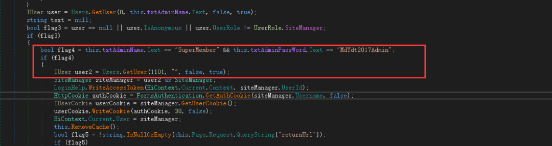 在寻找哪里有授权操作的时候发现登录逻辑处存在一个后门账户SuperMem)ber,密码为MdYdt2017Admin,会直接登录userid为1101的账户,通过数据库查看1101正好为admin管理员账户