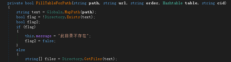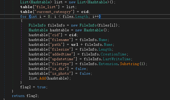 在FillTableForPath方法中调用了Directory.GetFiles,在函数的下方对获取到的files进行遍历,并将相关信息放入hashtable中,然后将hashtable添加到list中,而list又被赋值给table[“file_list”],这里的table也是一个传过来的Hashtable