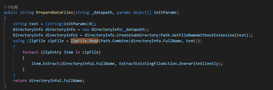 搜索解压的关键字,如zipFIle,ZipEntry等。找到PrepareDataFiles方法中调用了ZipFile.Read并且在下面遍历过程中解压了文件