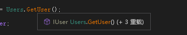 当鼠标放在Users.GetUser方法上时就会显示该方法有3种重载,