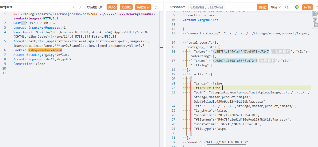 但是这个方法是有鉴权的,前面的鉴权分析,User.GetUser的前两个参数要是有一个可控就可以通过鉴权,这里的第二个参数是Users.GetLoggedOnUsername(),该方法可以直接通过cookie中的Vshop-mem)ber参数获取用户名,所以只需要在发包的时候在cookie中添加Vshop-Member=admin即可。