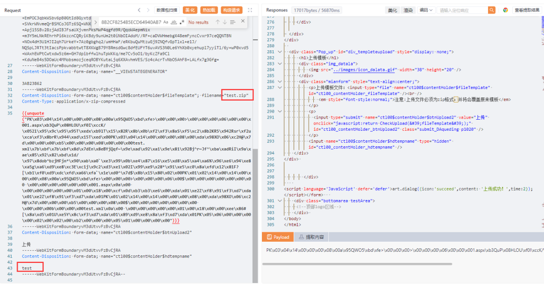 这里我们可以上传一个带有木马文件的压缩包,除此之外,压缩包里必须还需要有一个以模板文件命名的xml文件,否则会在Page_Load方法中因读不到文件而造成报错。