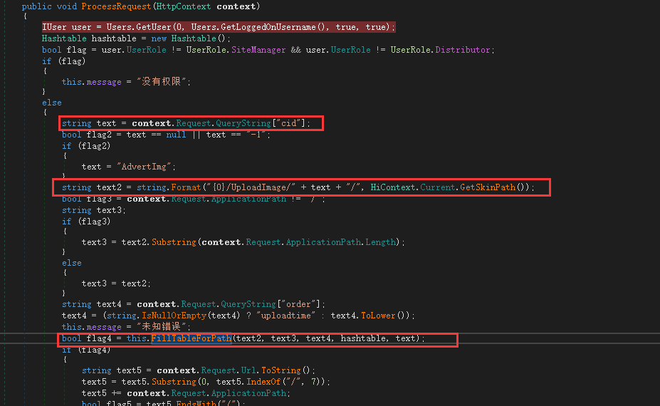 然后向上追溯FillTableForPath方法,查看第一个参数text2是否可控,从上面可以看出text2是从通过路径拼接text得来的,而text是通过cid参数赋值,参数可控,可以通过路径穿越获取指定目录的所有文件信息。