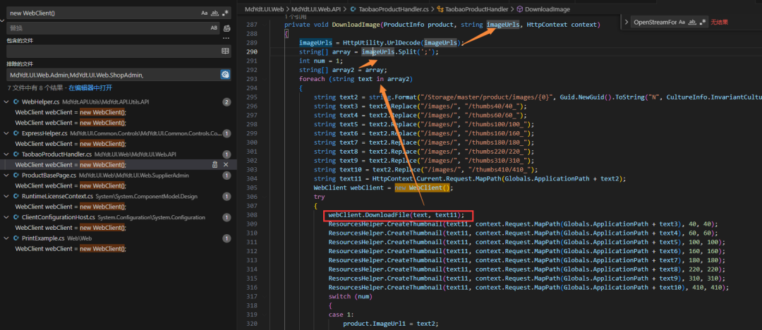 分别搜索这两个关键字,最后锁定这样一处,webClient.DownloadFile的第一个参数是下载的url,第二个参数是保存的路径