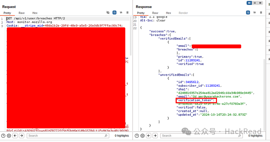 如我们所见,未验证电子邮件返回的数据没有经过验证。当我访问这个端点时,发现未验证电子邮件的响应中泄露了验证令牌!