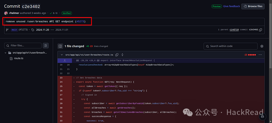 通过移除未使用的 API 端点 /user/breaches API GET 端点修复了漏洞