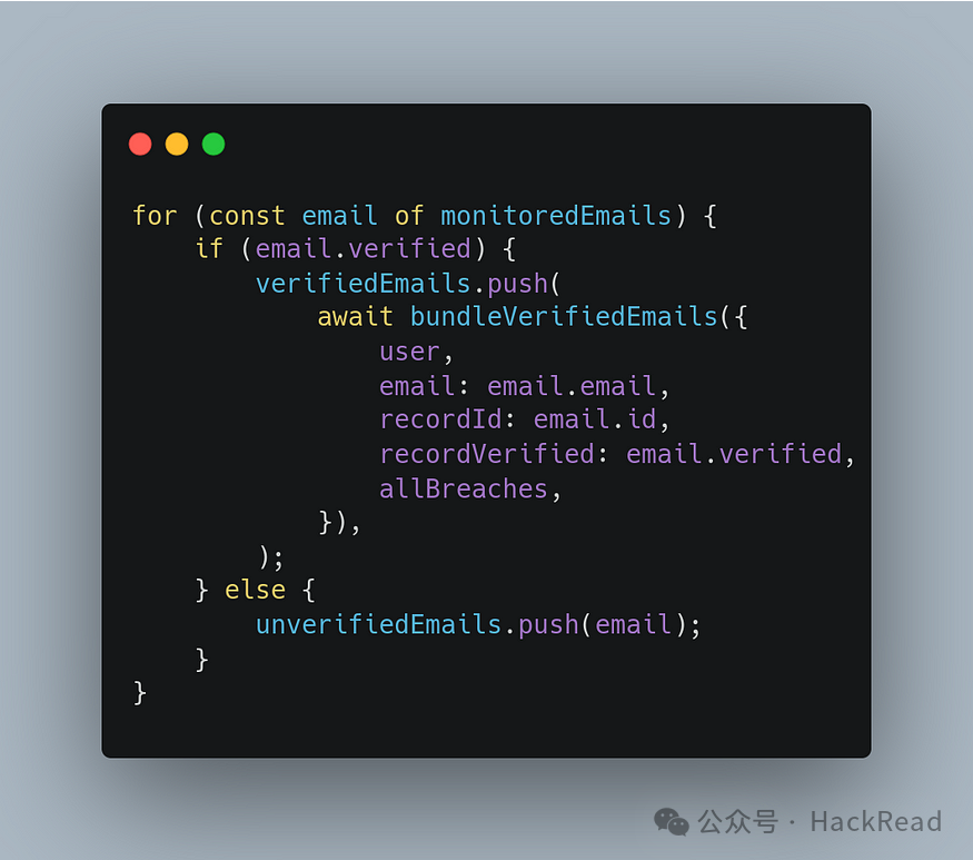 接下来,函数遍历 monitoredEmails。对于每个电子邮件,如果它被标记为已验证,则将其打包到 verifiedEmails 数组中。如果电子邮件未验证,则将其添加到 unverifiedEmails 数组中: