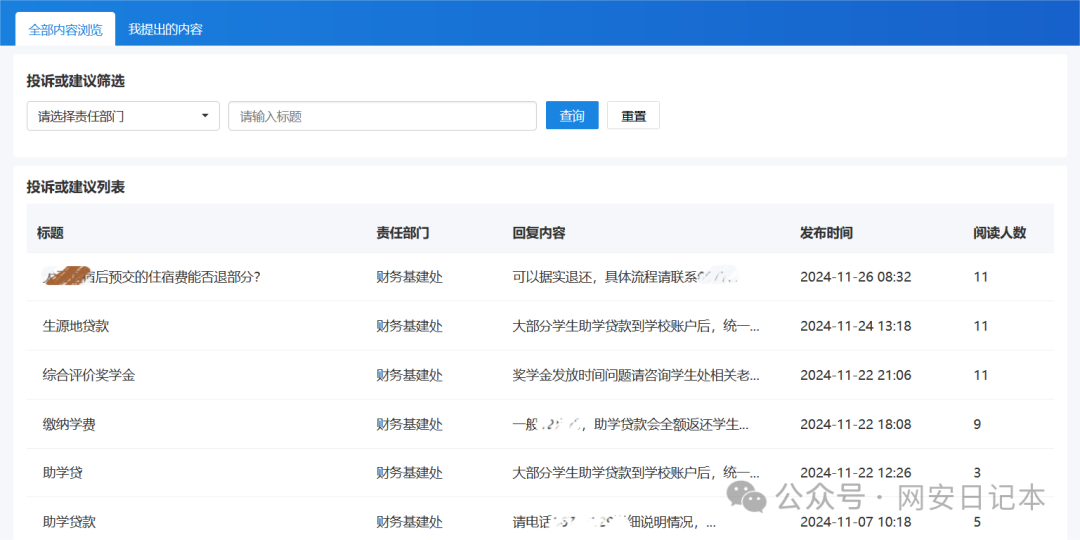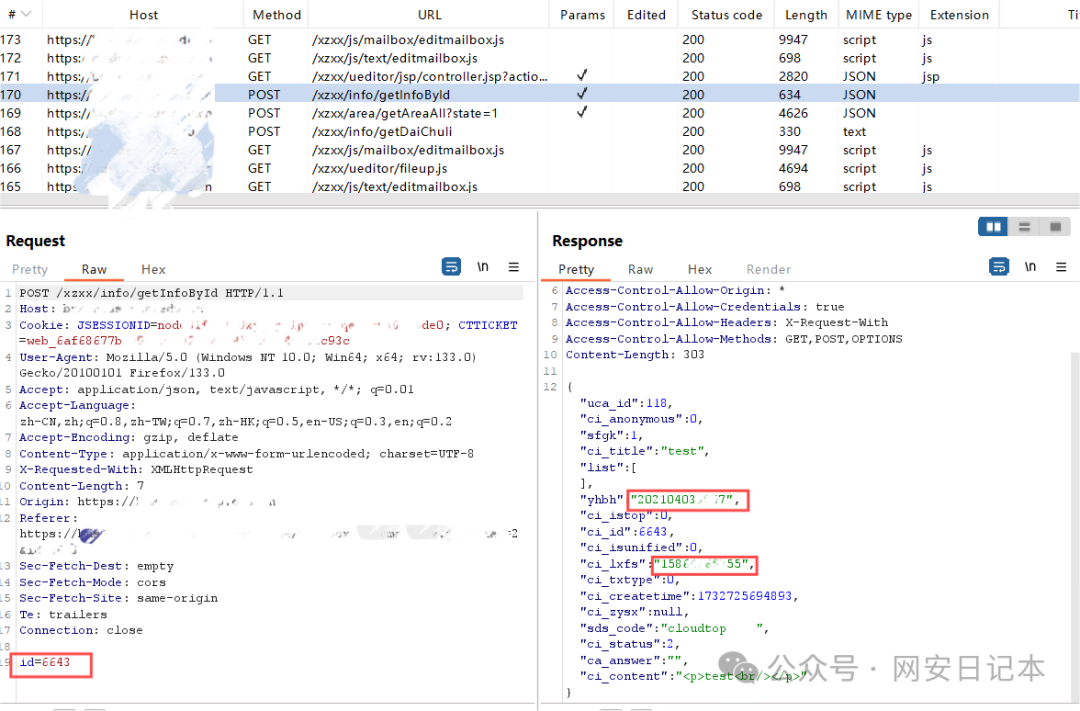 而且这次还出现了一个有意思的信息泄露,在上一次挖掘漏洞的时候有一个泄露学号和手机号的泄露,在查看整个系统界面的时候,响应包内会显示当前界面所有内容发布人的学号和手机号。而这次在测试的时候,其中一个请求包也是会泄露内容发布人的学号和手机号,而且只要更改请求包的**id**