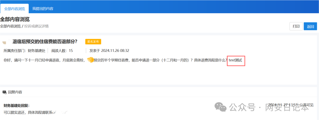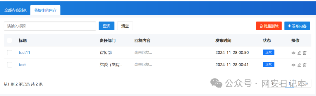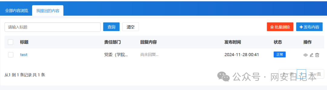 后面继续点击各个功能点进行测试,又回到了之前测试出现XSS漏洞的功能模块中,但这一次有了新的发现。在发布内容后,信息栏里面有一个操作列,其中存在****