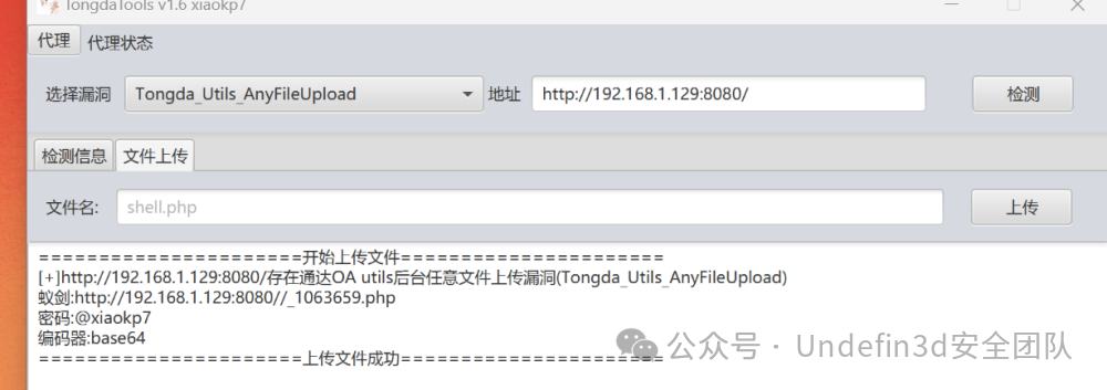 我们使用通达oa的工具进行测试发现一个文件上传的漏洞,我们直接传入🐎上线蚁剑
