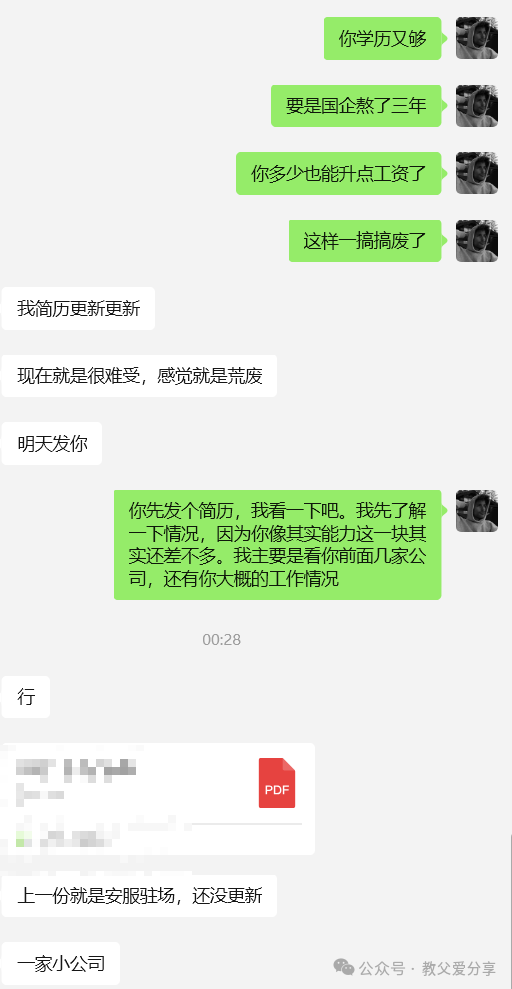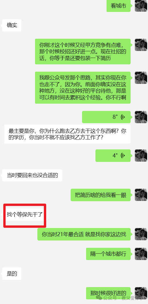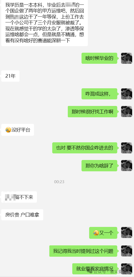 涉及网友隐私,就不露太多了,主要的意思就是不能再降级了,三年工作经验+一本+包装一下简历,找一家本地安全公司岗位还是机会很大的,哪怕不在自己父母城市,临近也行,回家方便就行