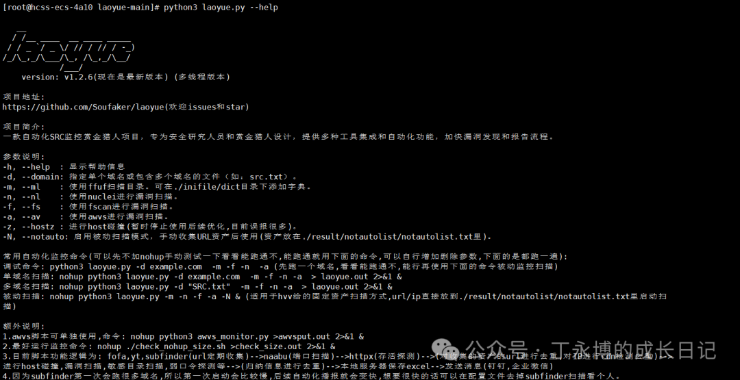 单域名扫描: nohup python3 laoyue.py -d example.com  -m -f -n -z -a  > laoyue.out 2>&1 &