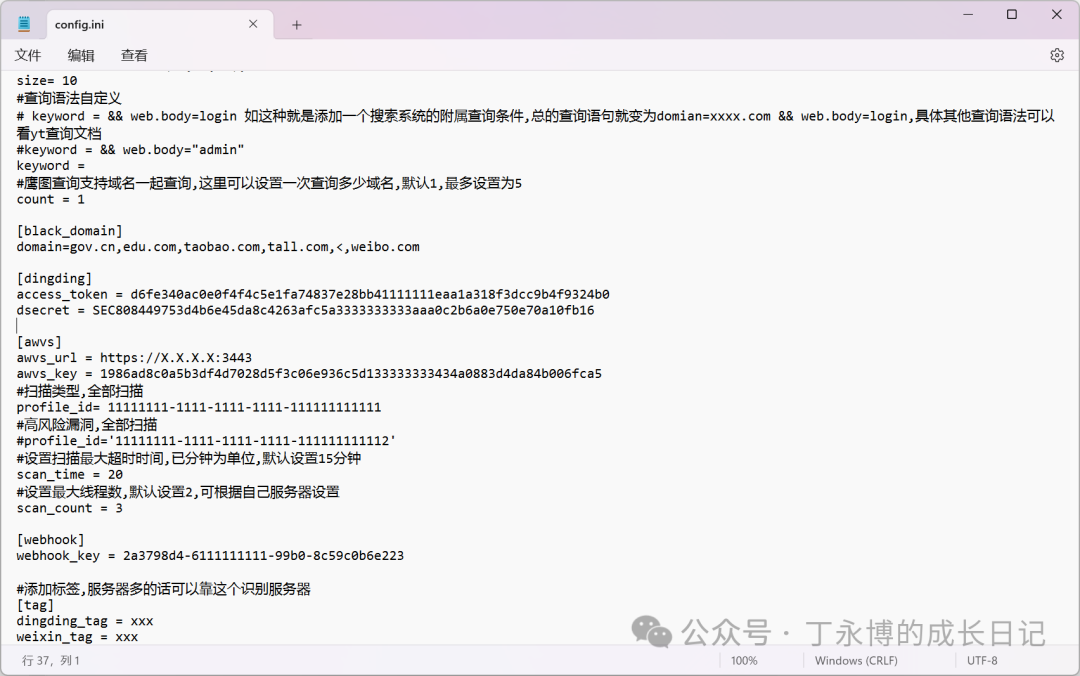 2.在config.ini中填入自己的各种key,包括某查的cookie,某fa的key,某图的key,钉钉的key(可以搞多个账号白嫖每天的500积分)