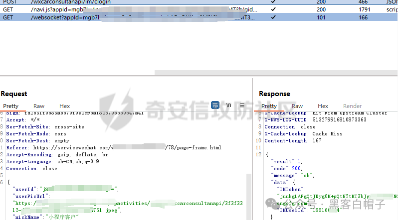 找到了接口,发送到repeater尝试修改userid,发现仍然会返回token,说明这里没有身份验证,可直接接管任意用户的聊天会话。写个python利用websocket库切入websocket会话,成功接管会话内容。