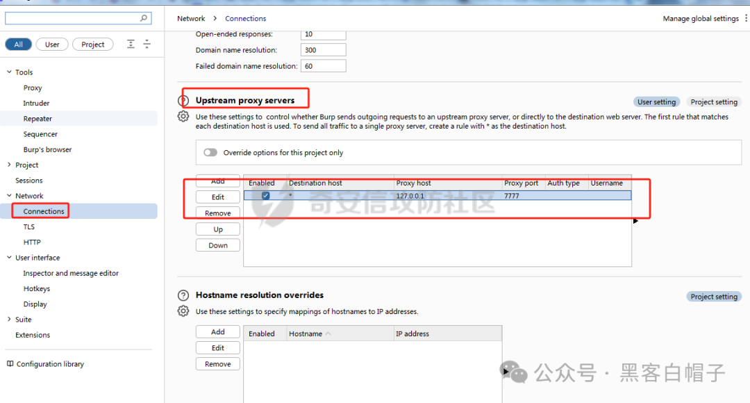 用于加载一个代理脚本,并监听7777端口,然后我们在burp中把数据包中转到7777端口,即可实现mitmproxy自动对数据包进行签名。burp设置如下: