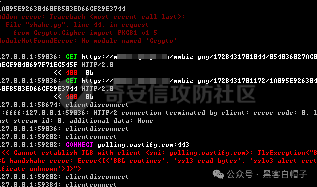 看到终端中有数据再跑了,说明配置成功,这里需要特别说明一下,在使用编译好的exe程序运行python程序时,可能会出现ModuleNotFoundError: No module named ‘Crypto’找不到库的情况,即使是最新版也有可能出现,这是一个bug,使用pip3重新安装mitmproxy即可解决