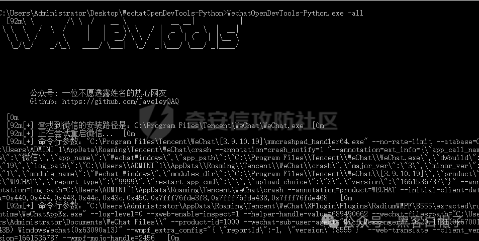 强制开启Devtools我用的是https://github.com/JaveleyQAQ/WeChatOpenDevTools-Python这个项目。对应使用的微信版本是WeChatSetup-3.9.10.19微信的历史版本可以在https://github.com/tom-snow/wechat-windows-versions/tags下载。这里需要注意一下的是,如果电脑上安装了高版本的微信,需要先卸载掉,再安装低版本,否则hook的时候会失败。并且hook有风险,建议使用小号在虚拟机里运行。程序的运行很简单,退出微信后执行