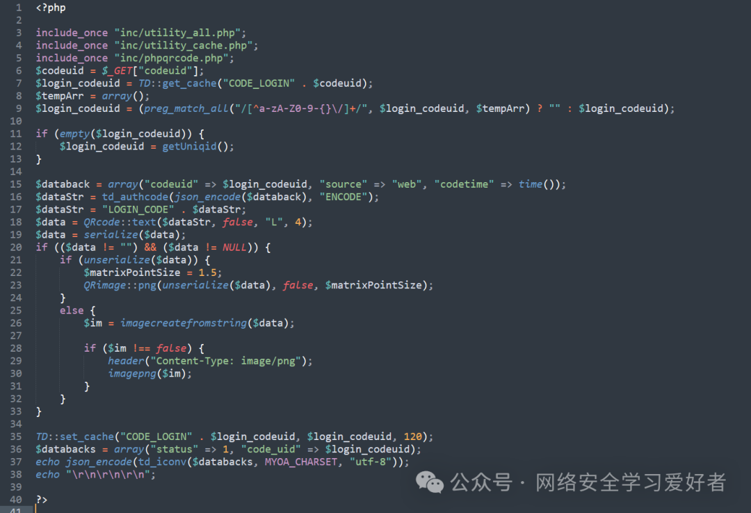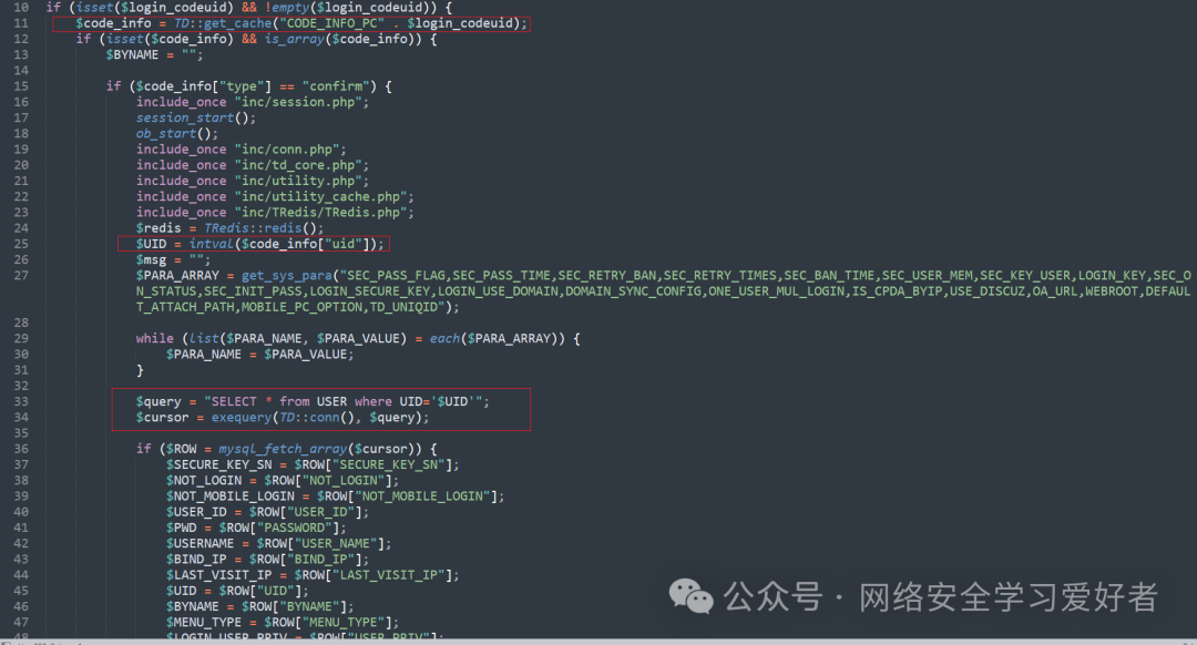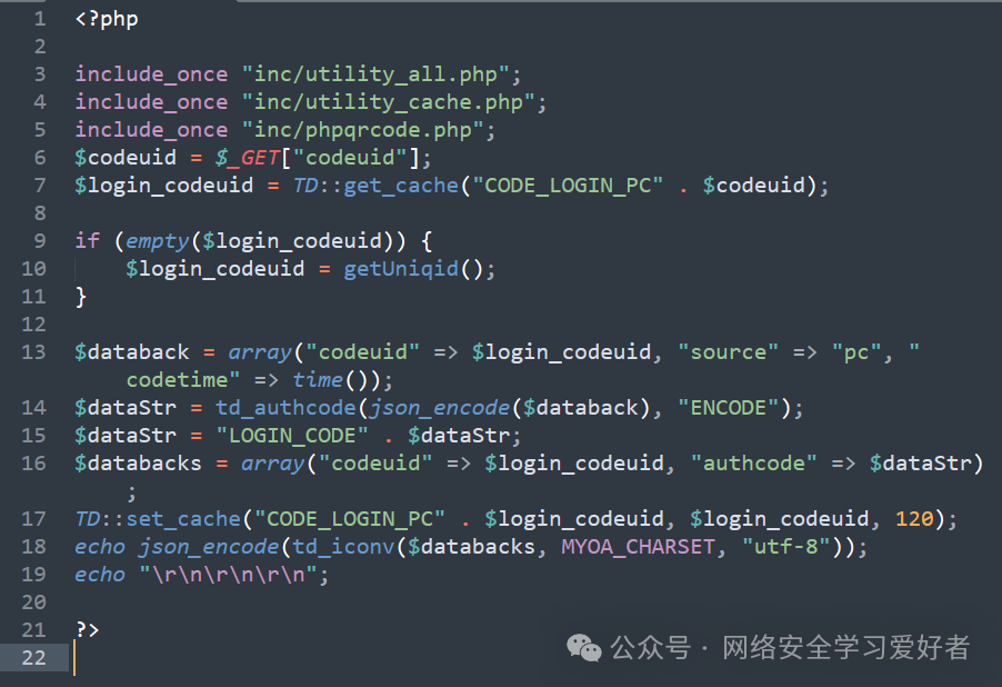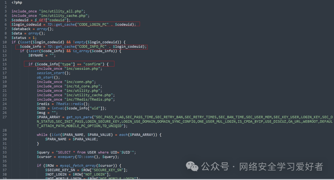 该文件用来获取codeuid参数,如果不存在,则会自动生成一个codeuid,并且将其写入CODE_LOGIN_PC缓存中(通达OA使用了缓存系统Redis,同时也提供了对缓存的使用方法),但是在18行位置将这个参数显示出来,导致用户可以获取这个参数的值,从而可以绕过后面的验证。