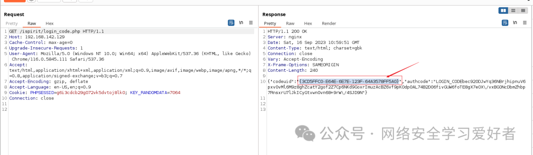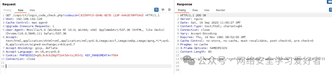第三步使用GET方式访问/ispirit/login_code_check.php,带上参数codeuid,让后台进行代入查询,并返回携带管理员身份信息的凭证。
