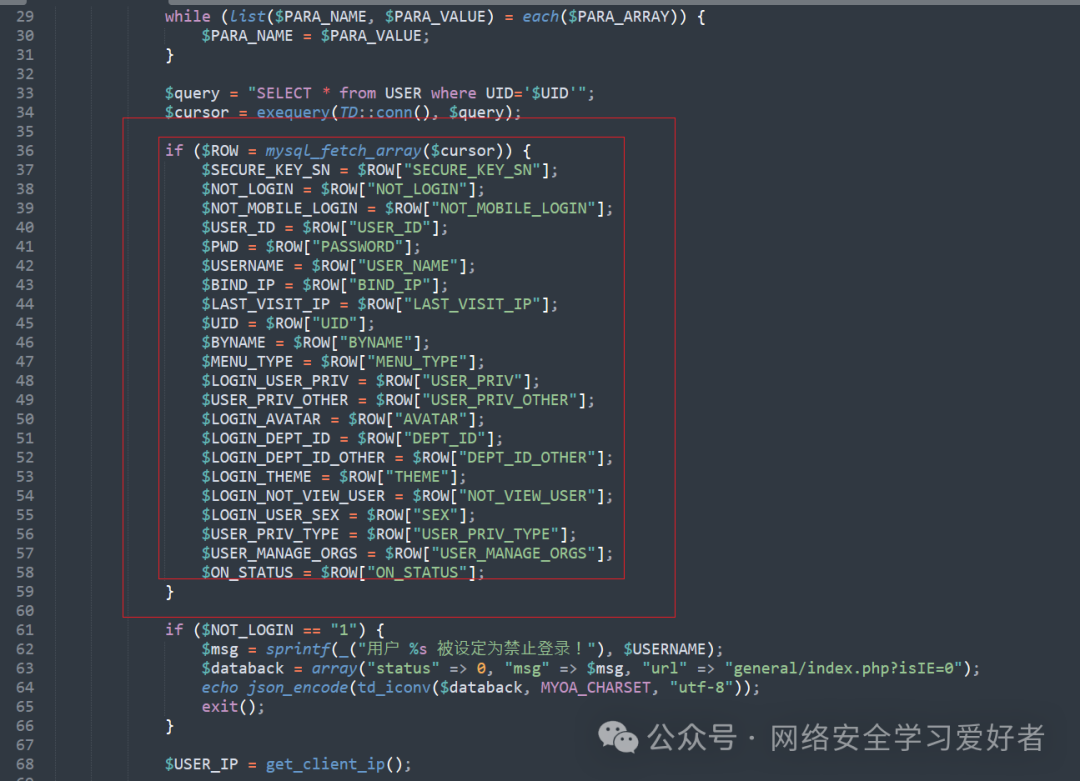 在这一文件中,用户可以控制输入的关键参数uid,在存在漏洞的通达OA版本中,后台数据库里uid对应的用户是admin管理员账户。并且将该数据存储在CODE_INFO_PC缓存中,因为我们在第一个文件中获取的codeuid存储在CODE_LOGIN_PC中,所以这里在复现时需要指明source变量为pc,这里的username则为admin,而type变量需要指明为confirm,原因在后面会进行解释。