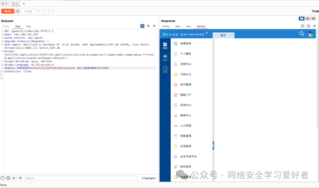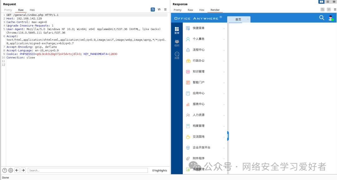 经过这步后客户端已经拥有了管理员的身份信息,直接访问OA主页/general/index.php,放行该数据包,成功以管理员身份登录OA系统。