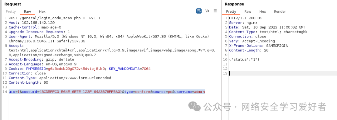 而后使用POST方式访问/general/login_code_scan.php提交payload,其中codeuid需要改为上一步中返回的值。