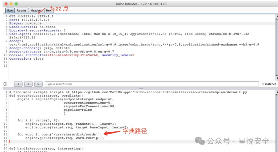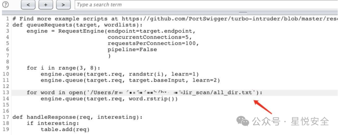 窗口的下面部分为自定义的 python 代码,用于生成字典并指导 Turbo Intruder 如何进行 fuzz。稍后再讲解代码的作用,我们需要修改的是13 行处字典的路径,修改成我们本地的目录字典路径,最好是英文的路径: