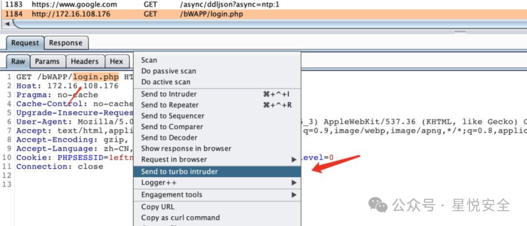 以网站目录扫描为例,对于要扫描的网站,可以在请求中选中要 fuzz (模糊测试)的点,下图中是 login.php 的地方,然后右键,选择 Send to turbo intruder