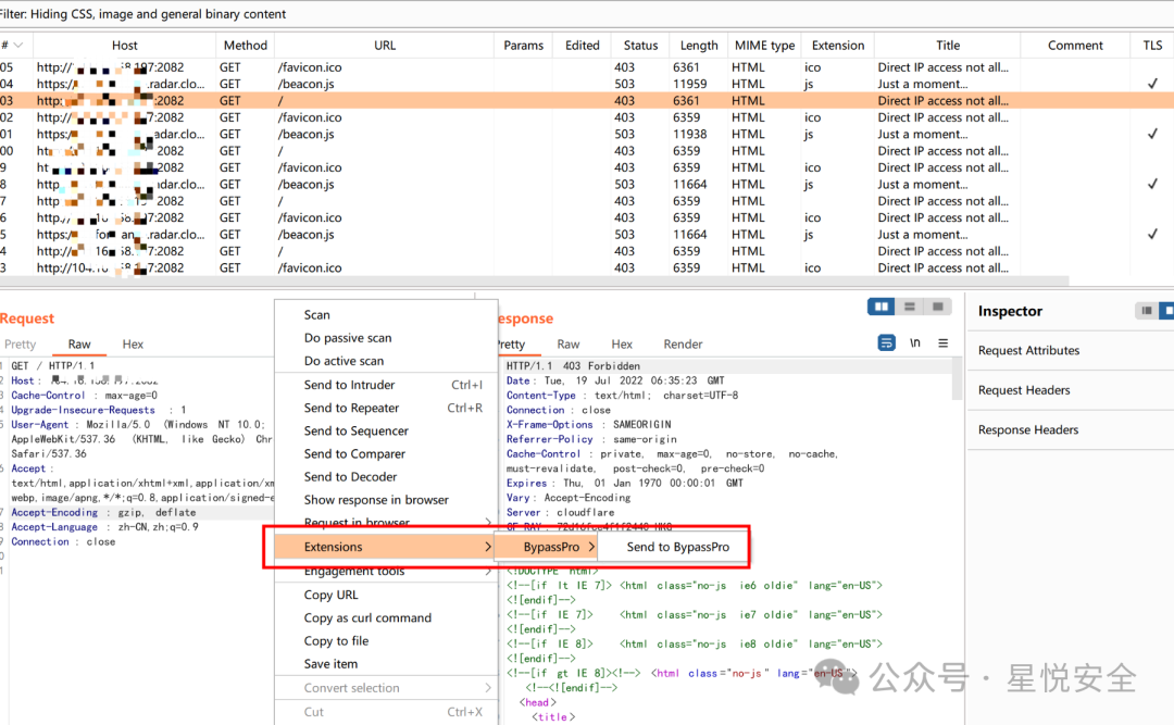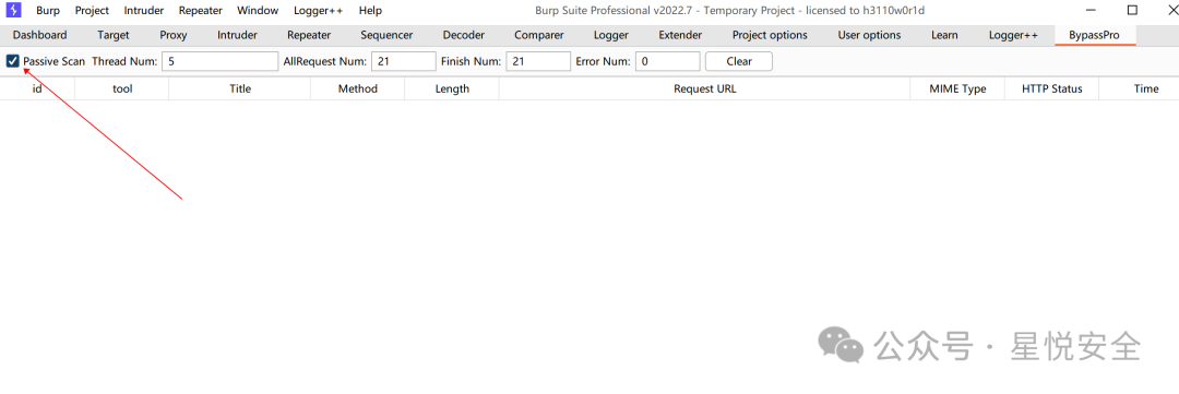 被动扫描:勾选上之后,proxy 流量中出现403 301 404 302 的时候去自动bypass 主动扫描:取消勾选之后,可以在proxy 流量中选择一些右键发送到BypassPro 去自动fuzz 当状态码是200,415,405则会进行回显,页面相似度80%以下进行回显