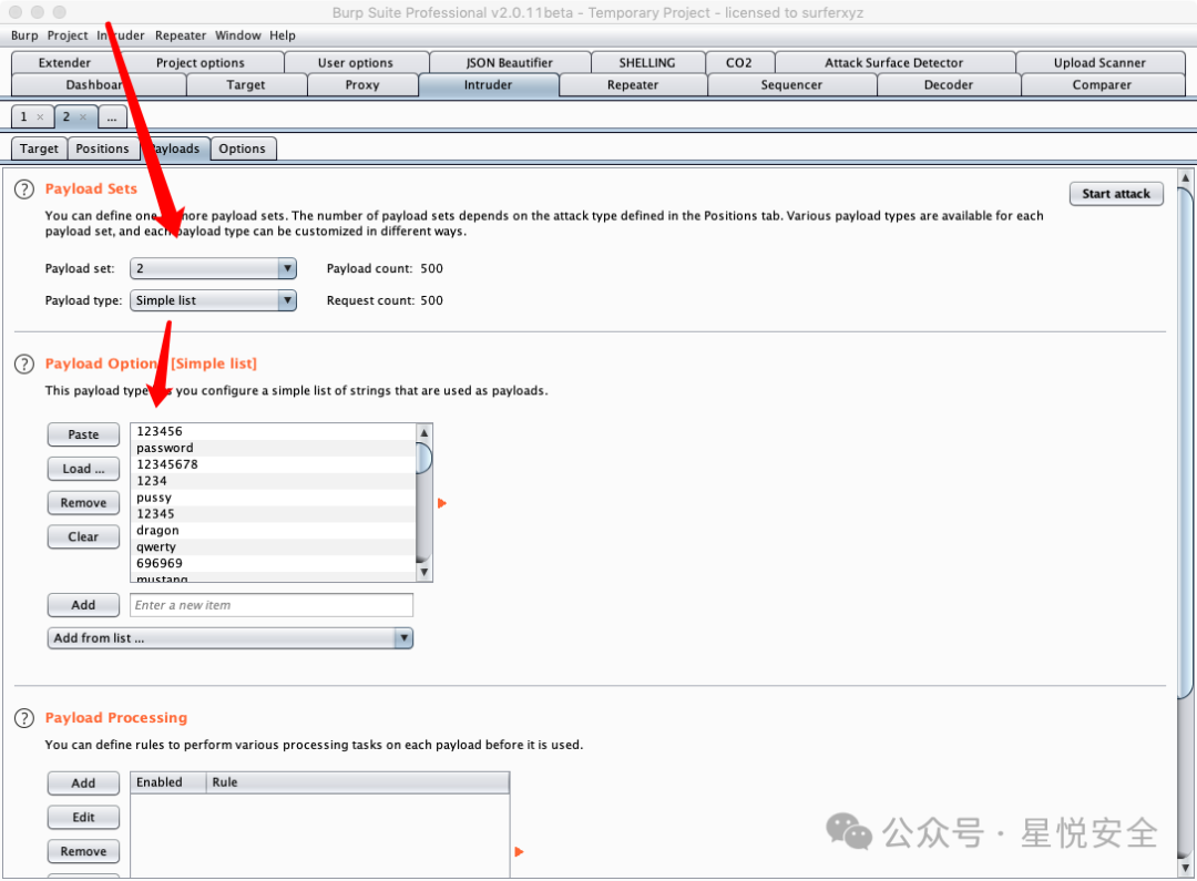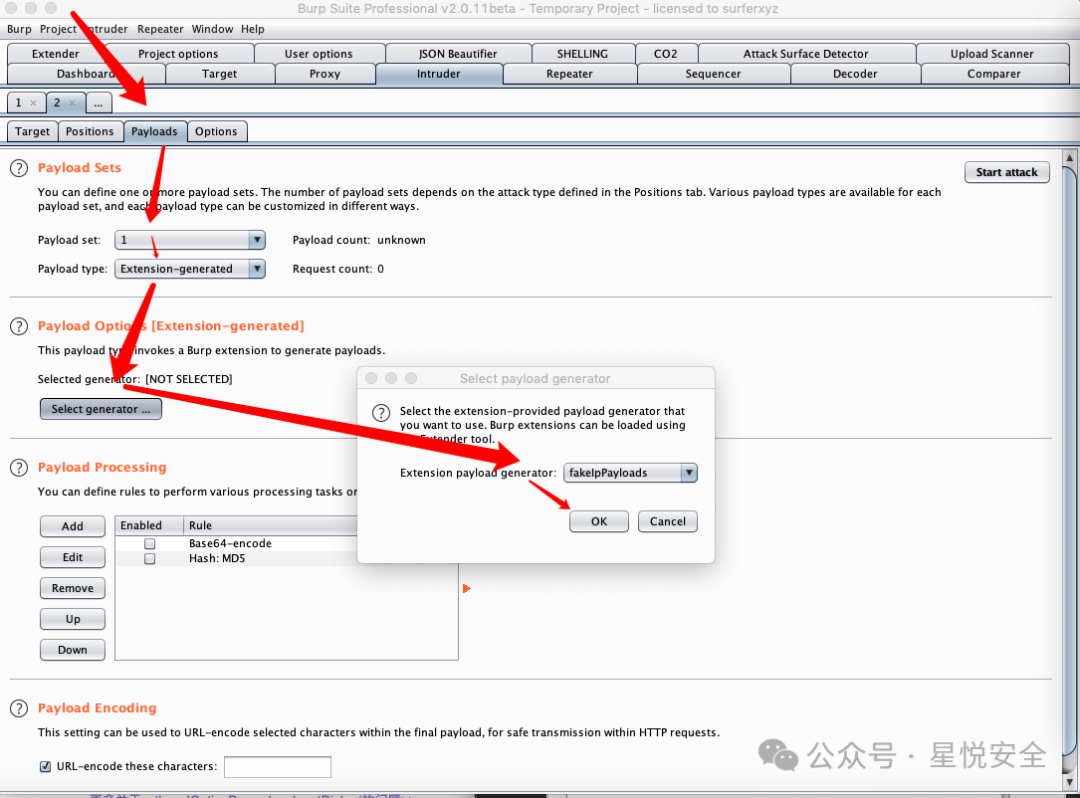按照箭头顺序将Payload来源设置为Extensin-generated,并设置负载伪fakeIpPayloads,然后设置第二个变量。