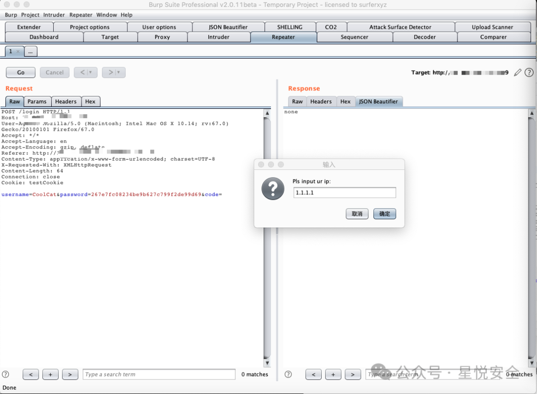 ‍在Repeater模块右键选择fakeIp菜单,然后点击inputIP功能,然后输入指定的ip: