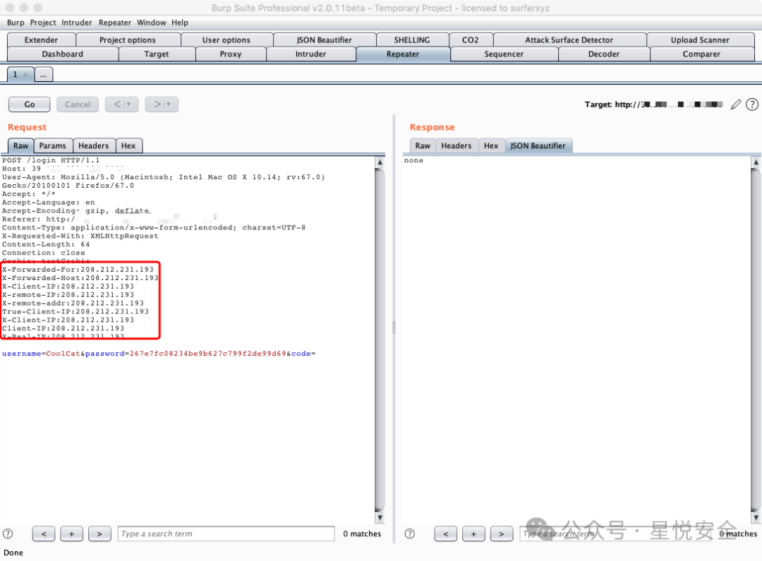 在Repeater模块右键选择fakeIp菜单,然后点击randomIP功能: