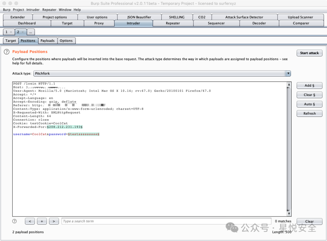 将数据包发送到Intruder模块,在Positions中切换Attack type为Pitchfork模式,选择好有效的伪造字段,以及需要爆破的字段: