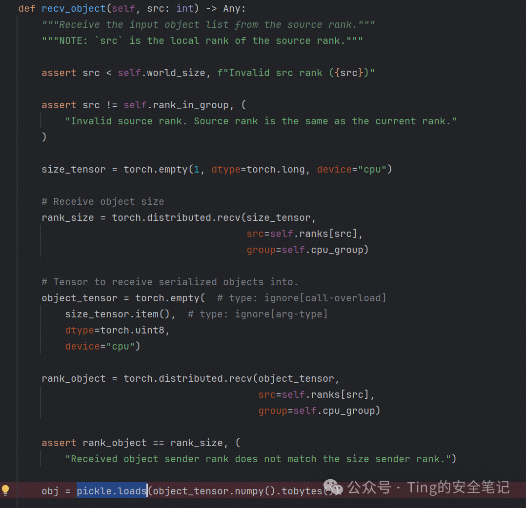 在recv_object方法中,使用了pickle.loads()对接收到的对象数据进行直接的反序列化 如图