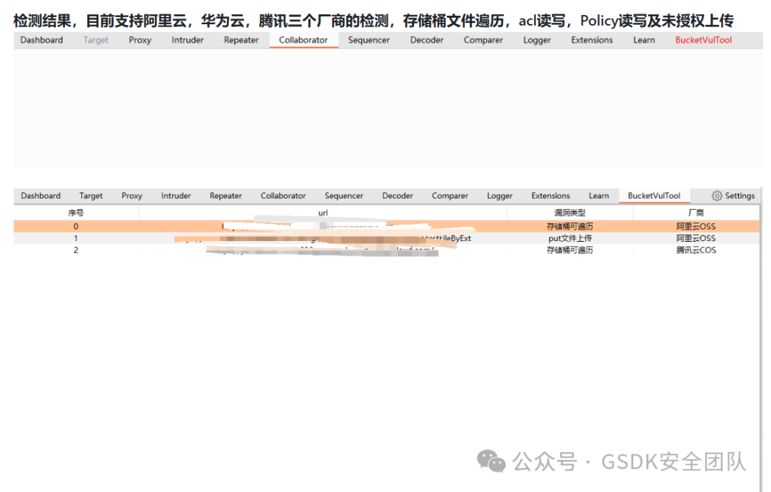Burpsuite存储桶配置不当漏洞检测插件。存储桶相关配置检测自动化,访问目标网站将会自动检测,如:访问的网站引用存储桶上的静态资源,就会触发检测逻辑,将指纹识别方式修改了下,通过server头及域名中的一个方式进行判断,另外由于敏感信息误报较多,已经取消了。