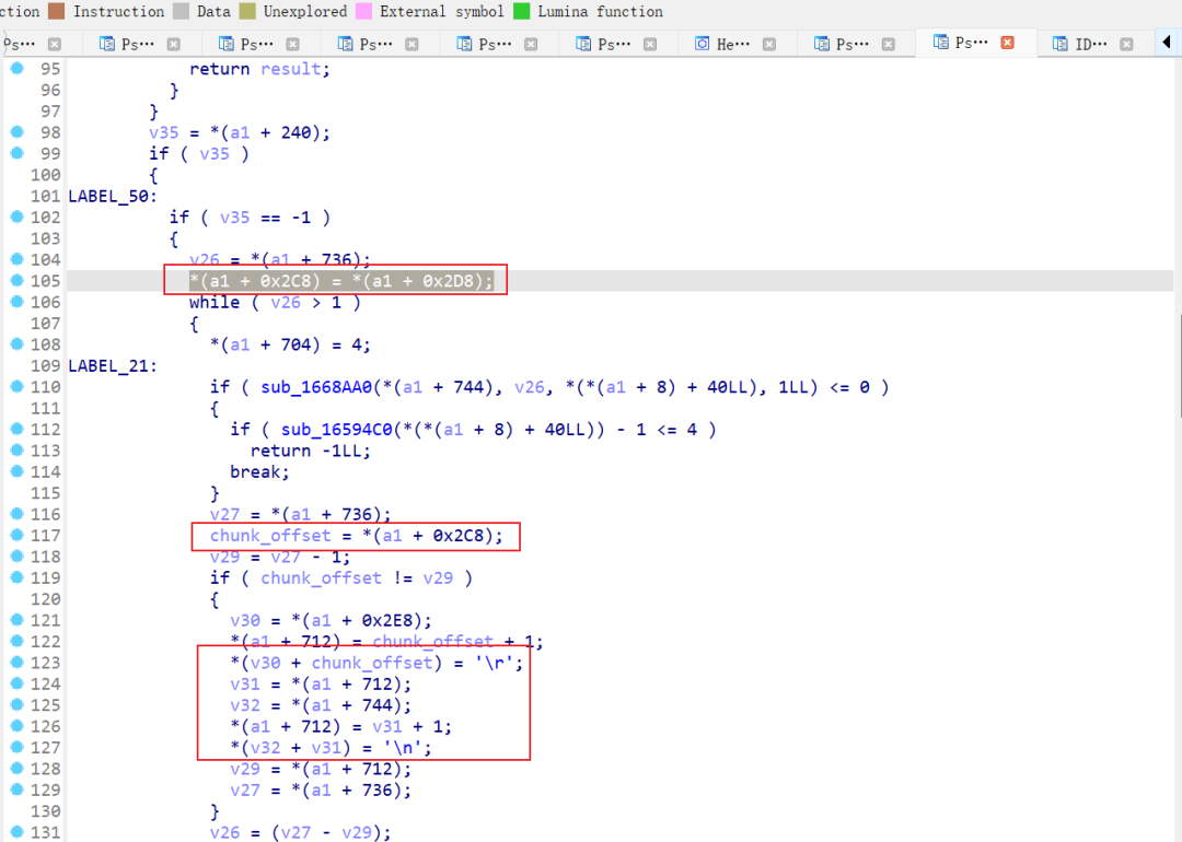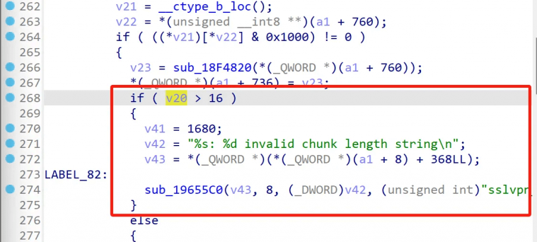 将存在漏洞的早期版本(比如这里选择FGT_VM64-v7.2.2)的init文件拖入IDA中进行分析定位漏洞点位。经过分析引发逻辑错误的函数是处理HTTP POST 的body体代码部分,即函数sub_1662BA0中。在读取chunk trailer时,写入\r\n的偏移chunk_offset的赋值来源于(_QWORD )(a1 + 0x2D8),通过回溯发现(_QWORD )(a1 + 0x2D8)的值来自于校验chunk length长度的代码块。当chunk length字段经过hex解码后值为0时,就会进入到chunk trailer读取的逻辑。