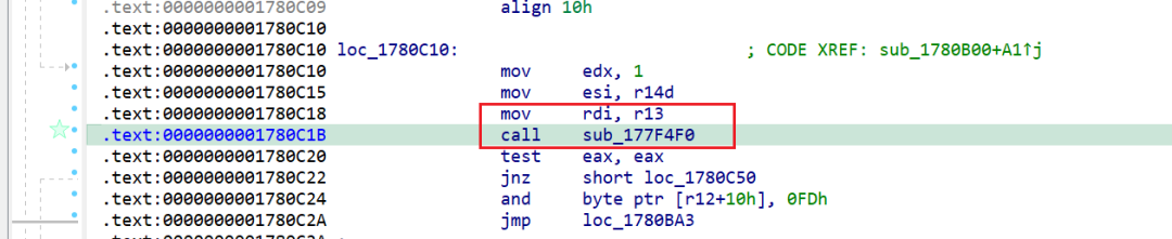 继续向上回溯找到父函数sub_1780B00,位置0x0000000001780B3B处调用了子函数sub_177F4F0,r13中保存的正是参数a1,这样当sub_177F4F0调用后会把a1重新置为我们伪造的值。
