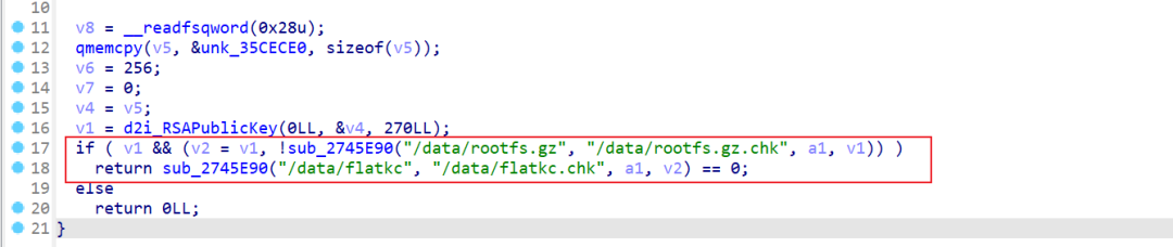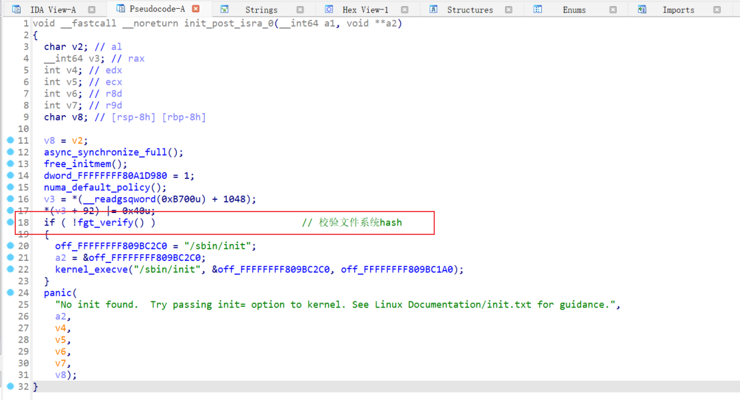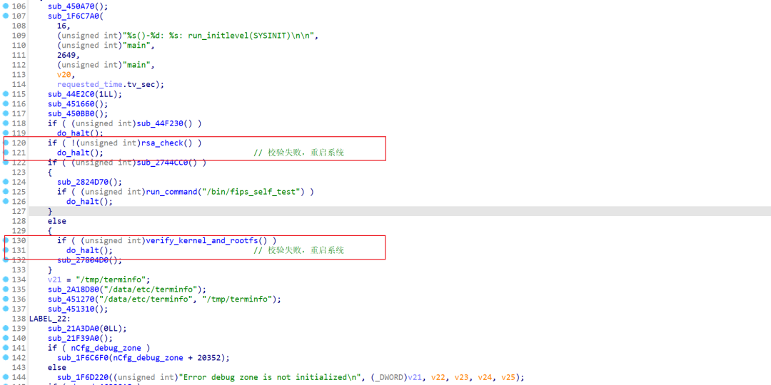 fgt_verify 用于校验文件系统 hash,校验成功则会启动 /sbin/init 进程,最后执行 /bin/init。该程序 main 函数中首先会有几处校验,如果校验失败就会调用 do_halt 重启系统: