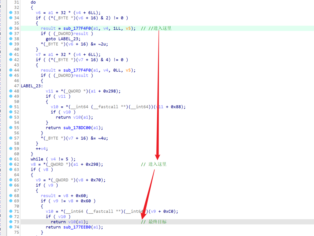 如上图,满足(_BYTE )(a1 + 32 * (v4 + 6LL) + 16) & 2) == 0 0 < v4 < 5就能执行(__int64 (__fastcall )(__int64))((_QWORD *)(a1 + 0x298)+0x70))(a1)